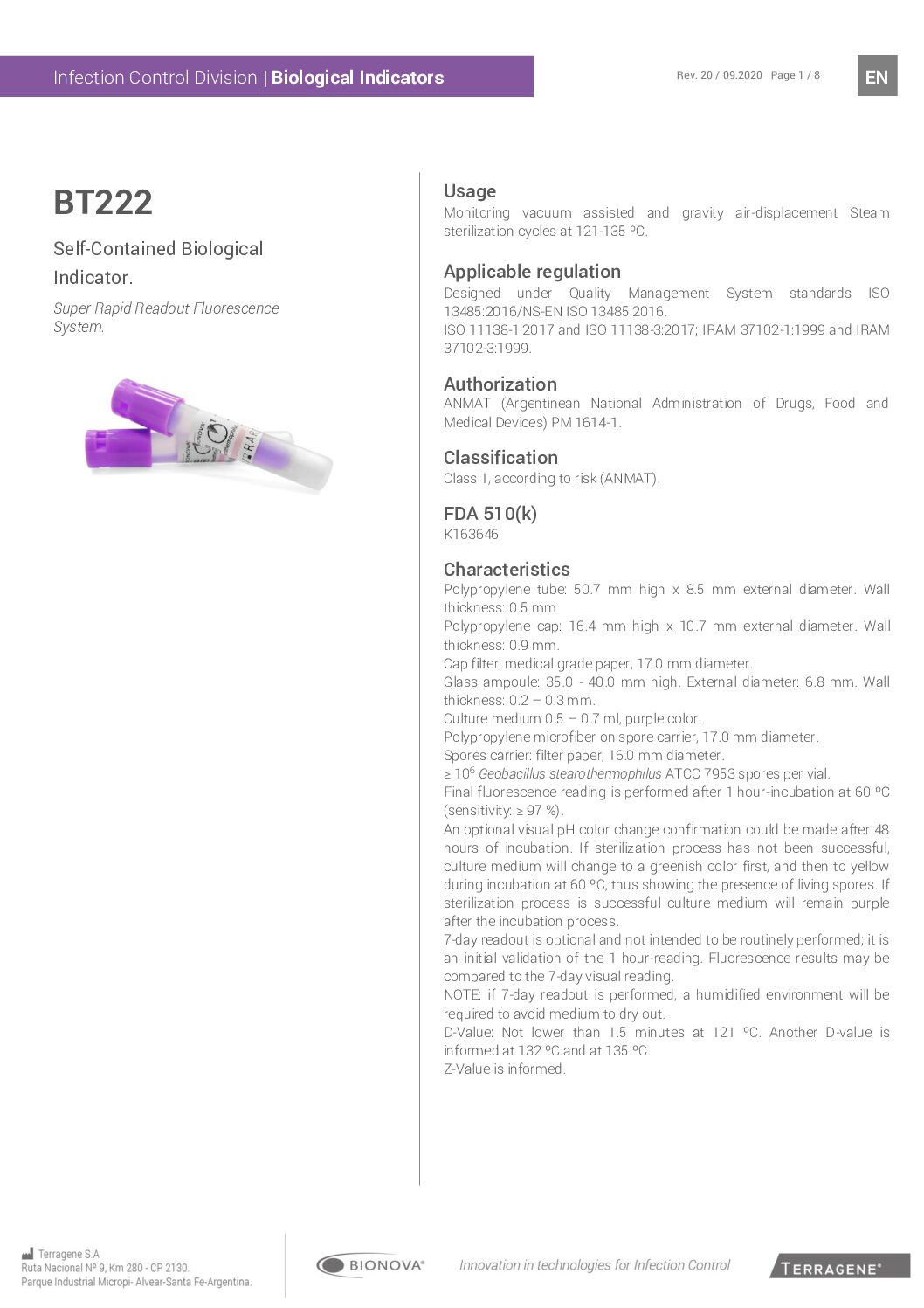Products Code: Terragene Bionova BT222 Steam Super Rapid Self-contained Biological Indicator (1 hour)